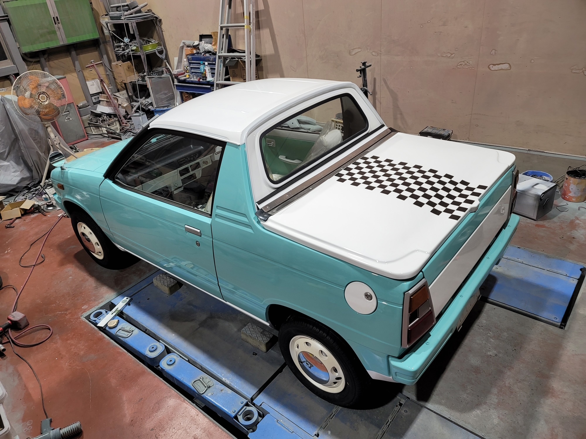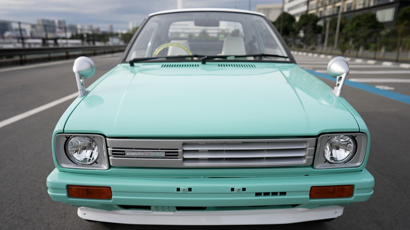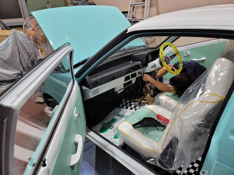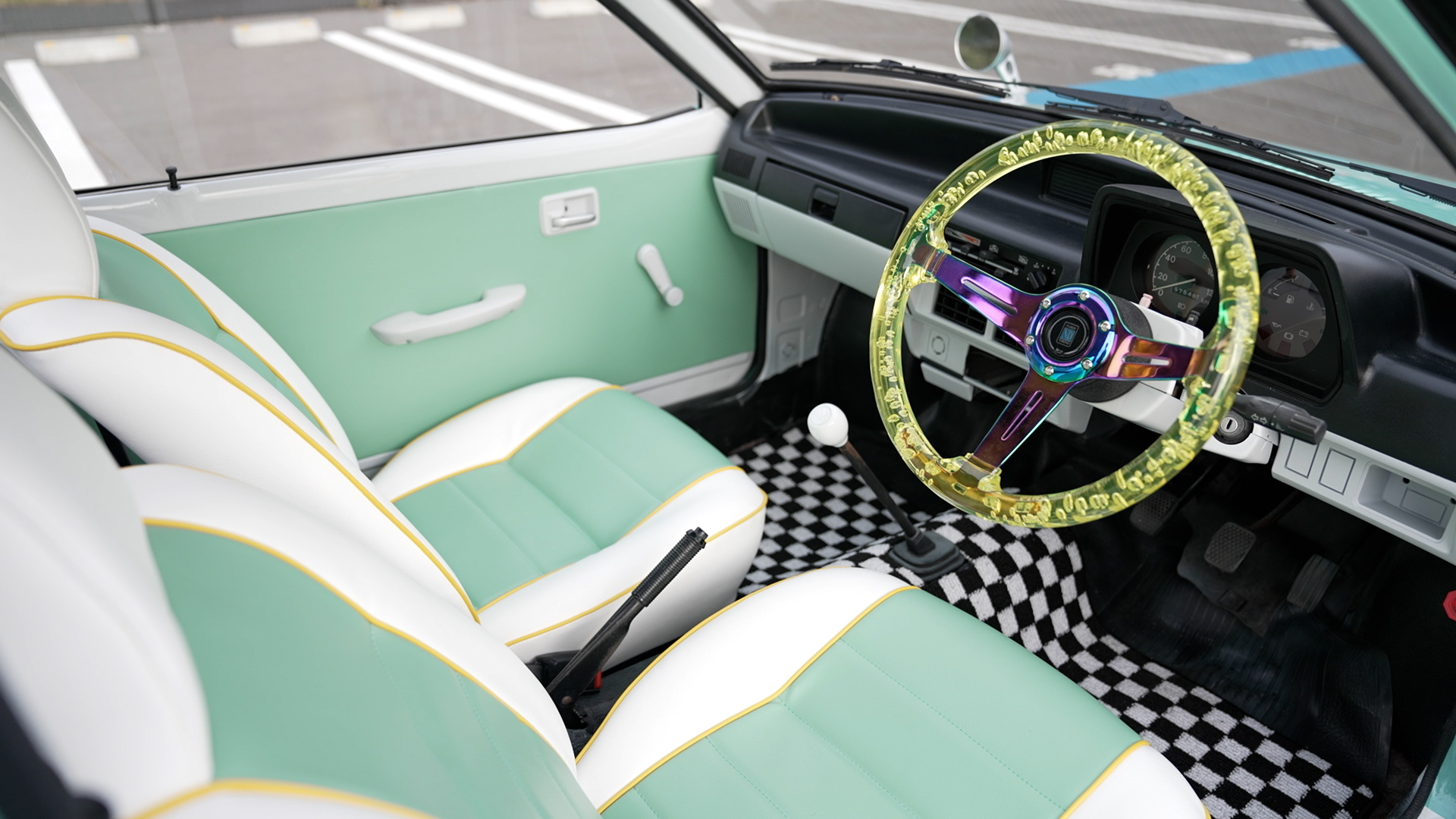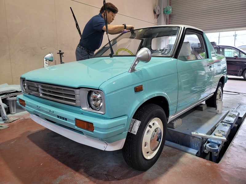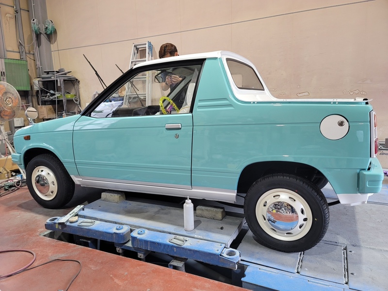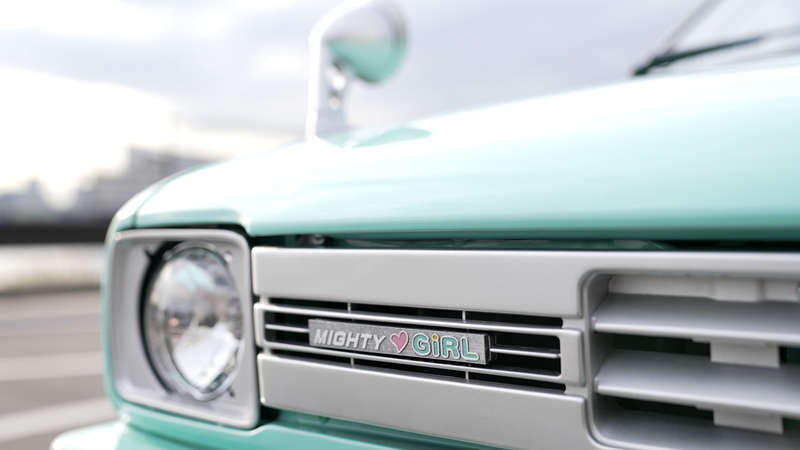 エンジンを再始動メンテナンスして降ろした後、エンジンルームも含めた全塗装を施しました。フワちゃんのリクエストであるライトなミントグリーンとホワイトのツートーンに仕上げた塗装で年式を感じさせないキュートなミニピックアップに大変身!市松模様風のチェッカーステッカーや砲弾型のフェンダーミラーもレーシーです。ホイールはあえて純正スチールホイールにホイールキャップの仕様。シートやドアトリムも外装に合わせて二色で張り替え、スケルトンイエローのステアリングにシフトノブと内装も格安ですが存在感は抜群!フワちゃんも絶賛の一台「MIGHTY GIRL」が完成しました。