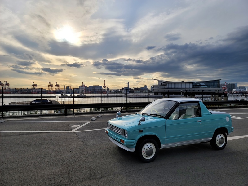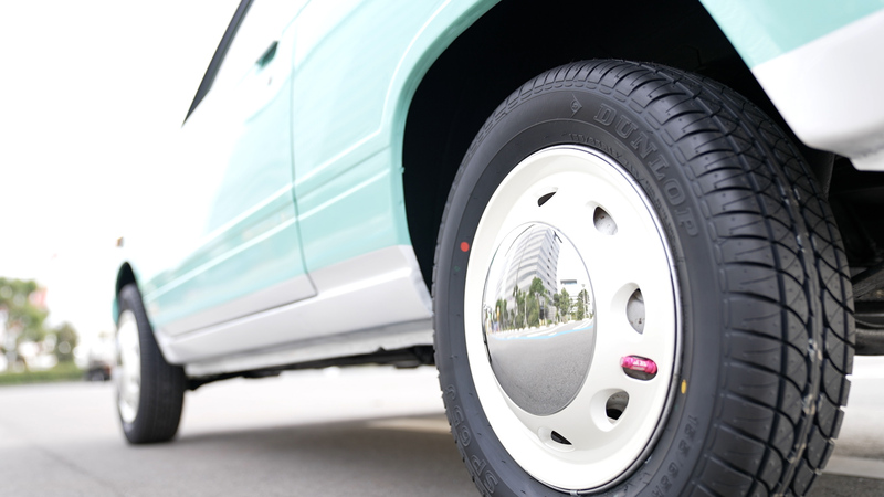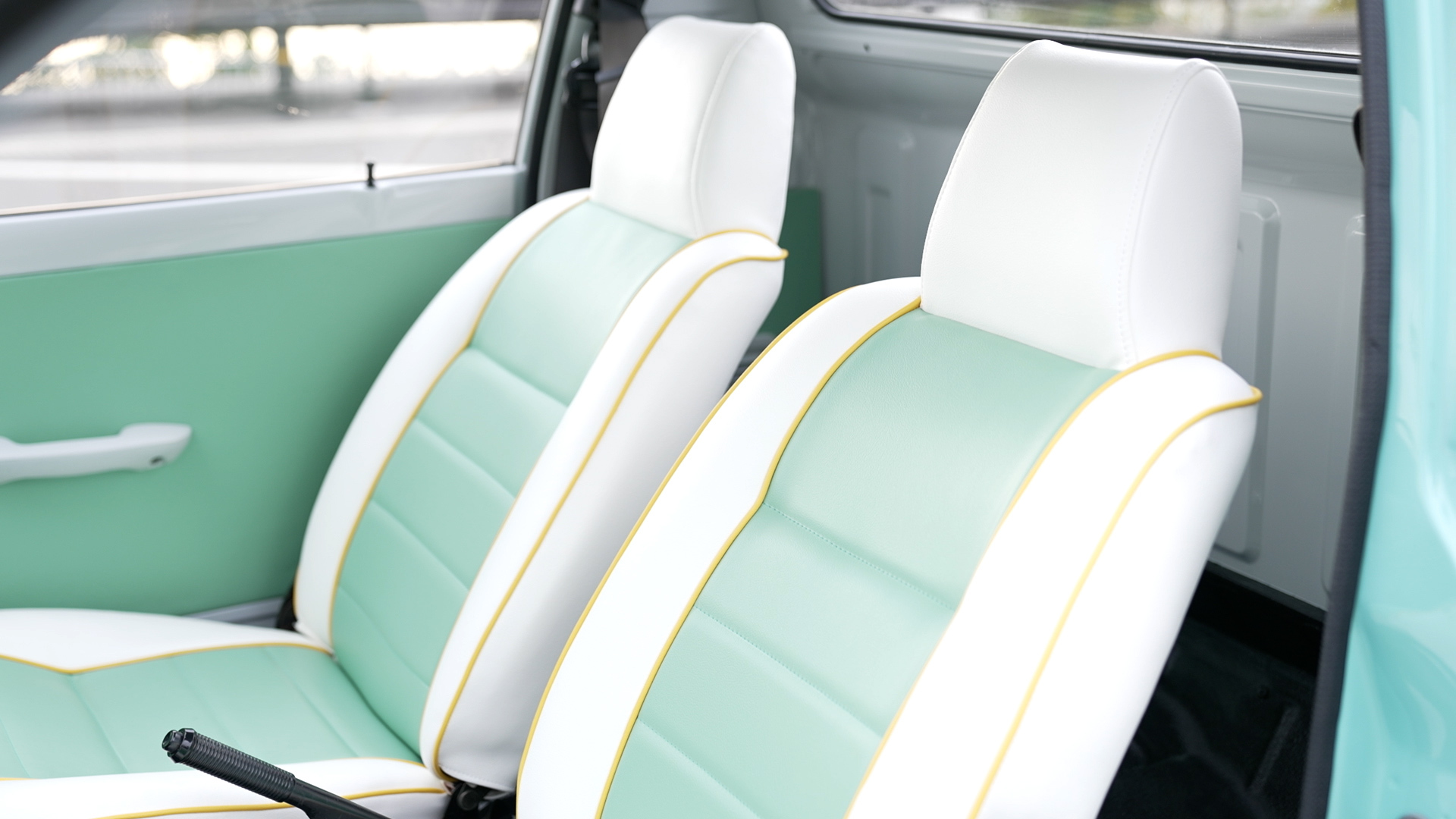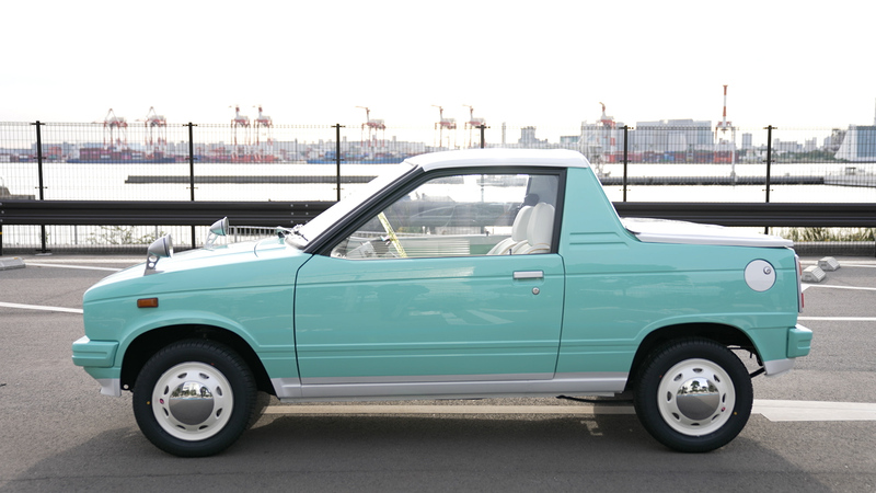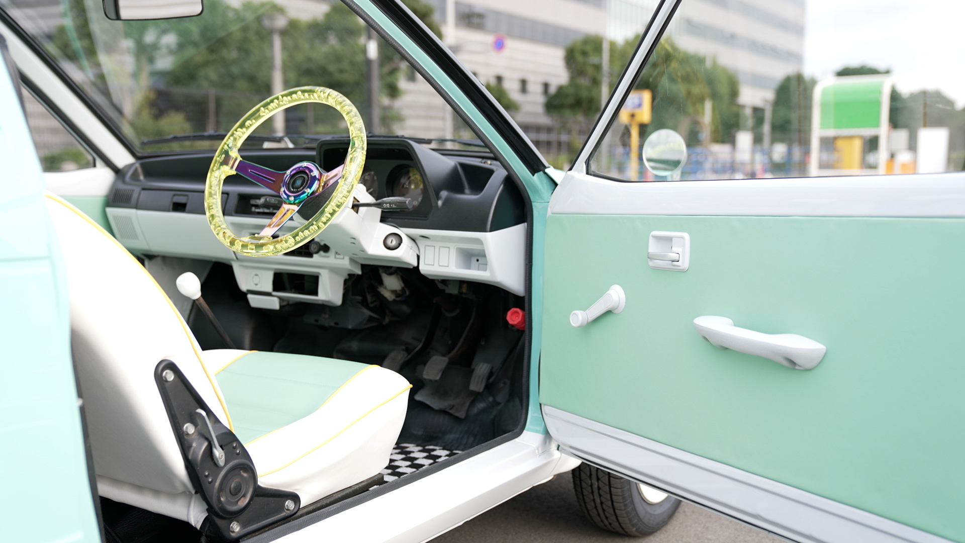 エンジンを再始動メンテナンスして降ろした後、エンジンルームも含めた全塗装を施しました。フワちゃんのリクエストであるライトなミントグリーンとホワイトのツートーンに仕上げた塗装で年式を感じさせないキュートなミニピックアップに大変身!市松模様風のチェッカーステッカーや砲弾型のフェンダーミラーもレーシーです。ホイールはあえて純正スチールホイールにホイールキャップの仕様。シートやドアトリムも外装に合わせて二色で張り替え、スケルトンイエローのステアリングにシフトノブと内装も格安ですが存在感は抜群!フワちゃんも絶賛の一台「MIGHTY GIRL」が完成しました。